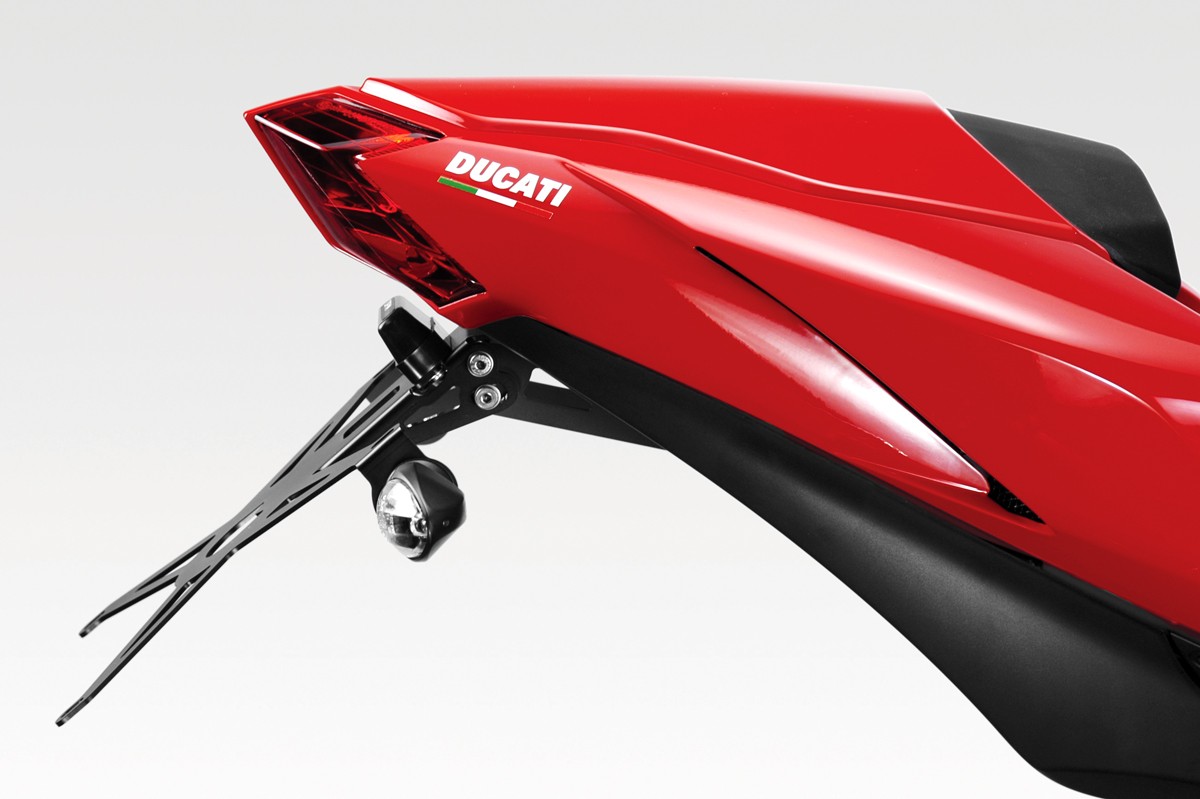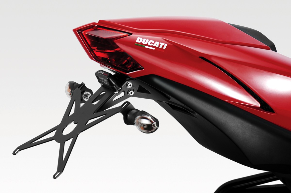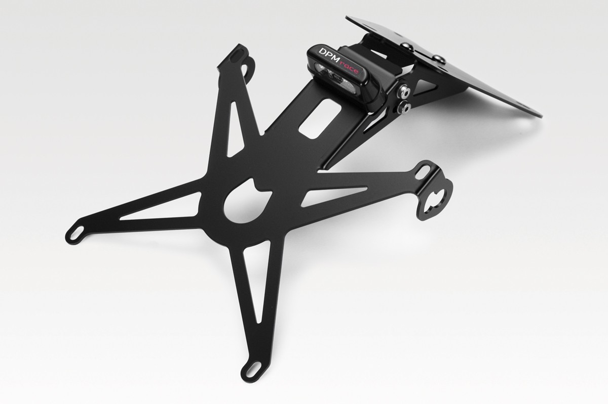 Adjustable inclination license plate holder from 30? upwards with 4-points-locking. Supplied with LED license plate light, hardware fasteners, and assembly instructions. The kit offers the possibility of reusing the original or after-market indicators and applies without making any modifications to the motorbike.