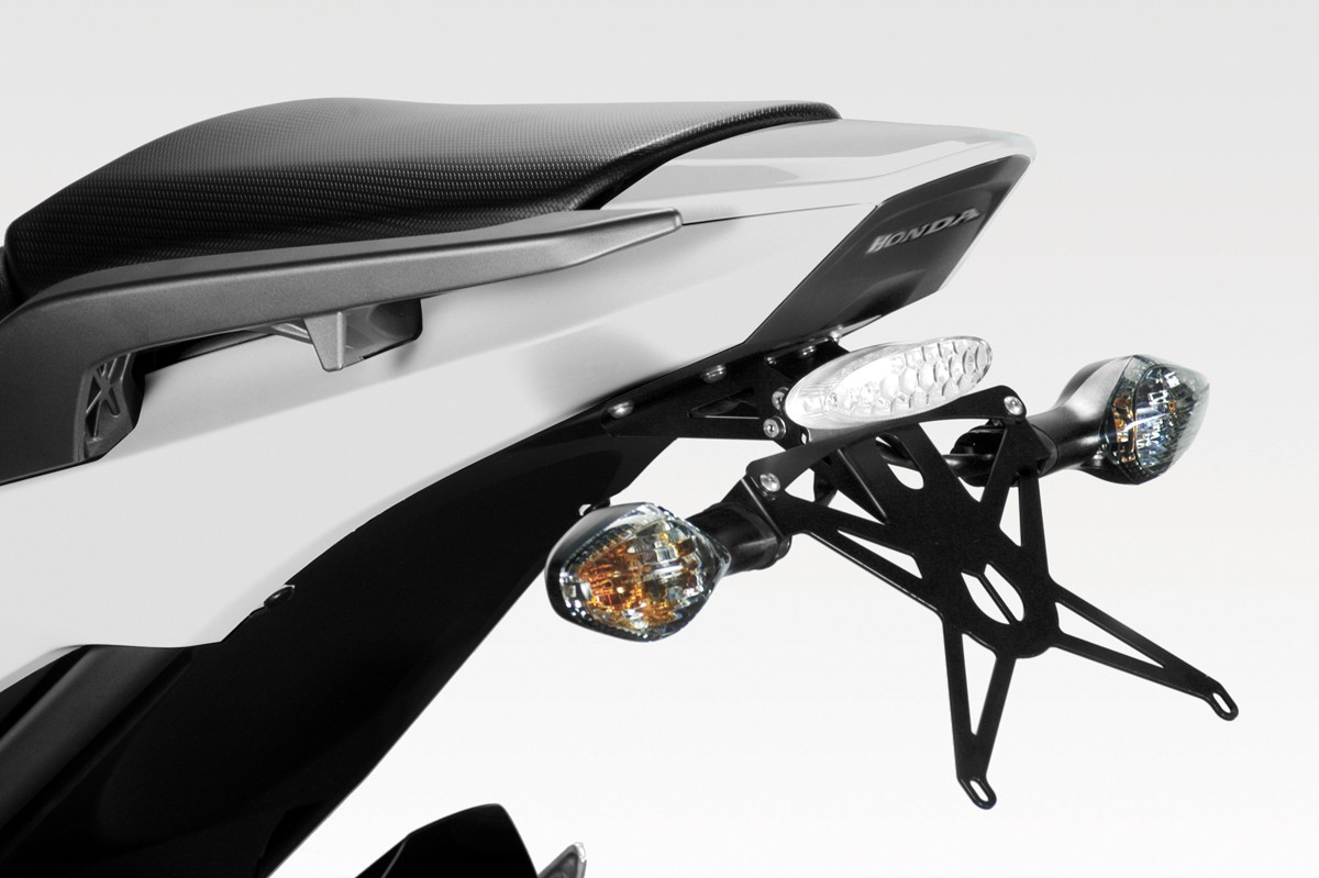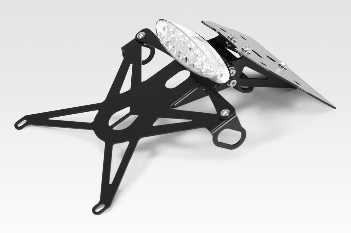Adjustable inclination license plate holder with 4-points-locking. The kit offers the possibility of reusing the original or after-market indicators. Complete with E11 approved LED tail light with three lights: Position, Stop and License plate light.