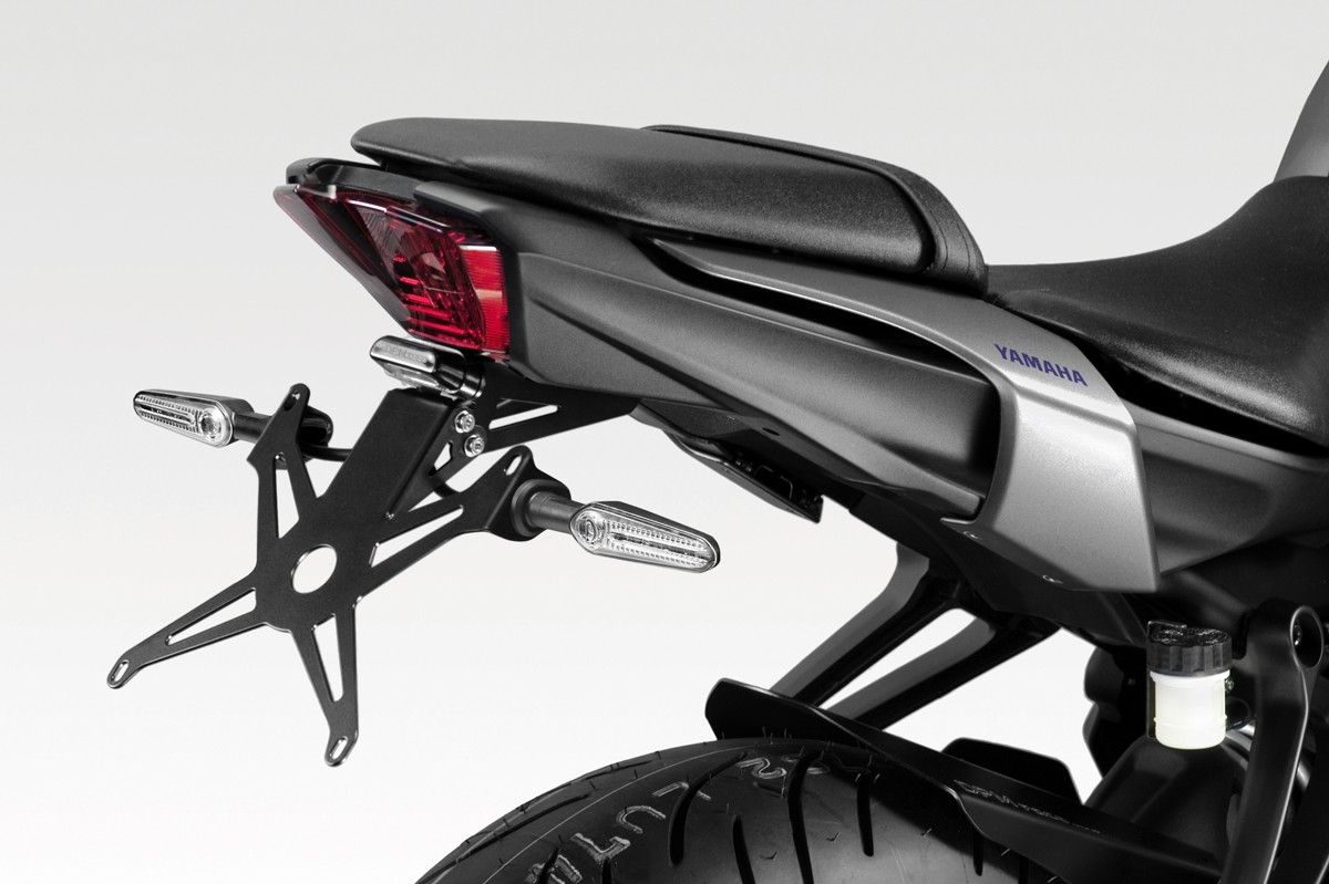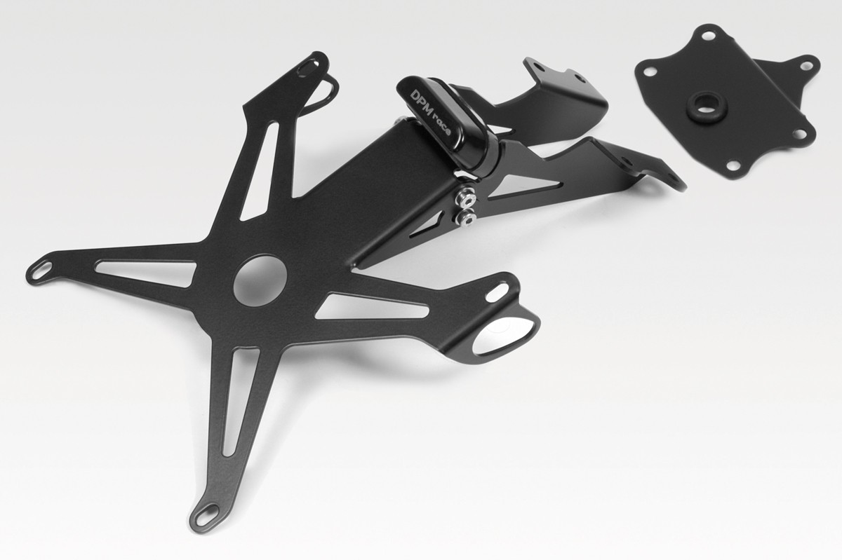 Adjustable inclination license plate holder with 4-points-locking. Supplied with LED license plate light, hardware fasteners, and assembly instructions. It applies without making any modifications to the motorbike and can reuse the original indicators.