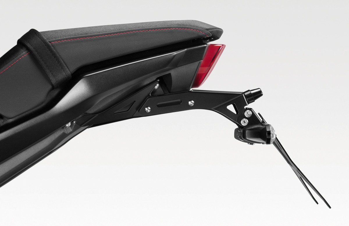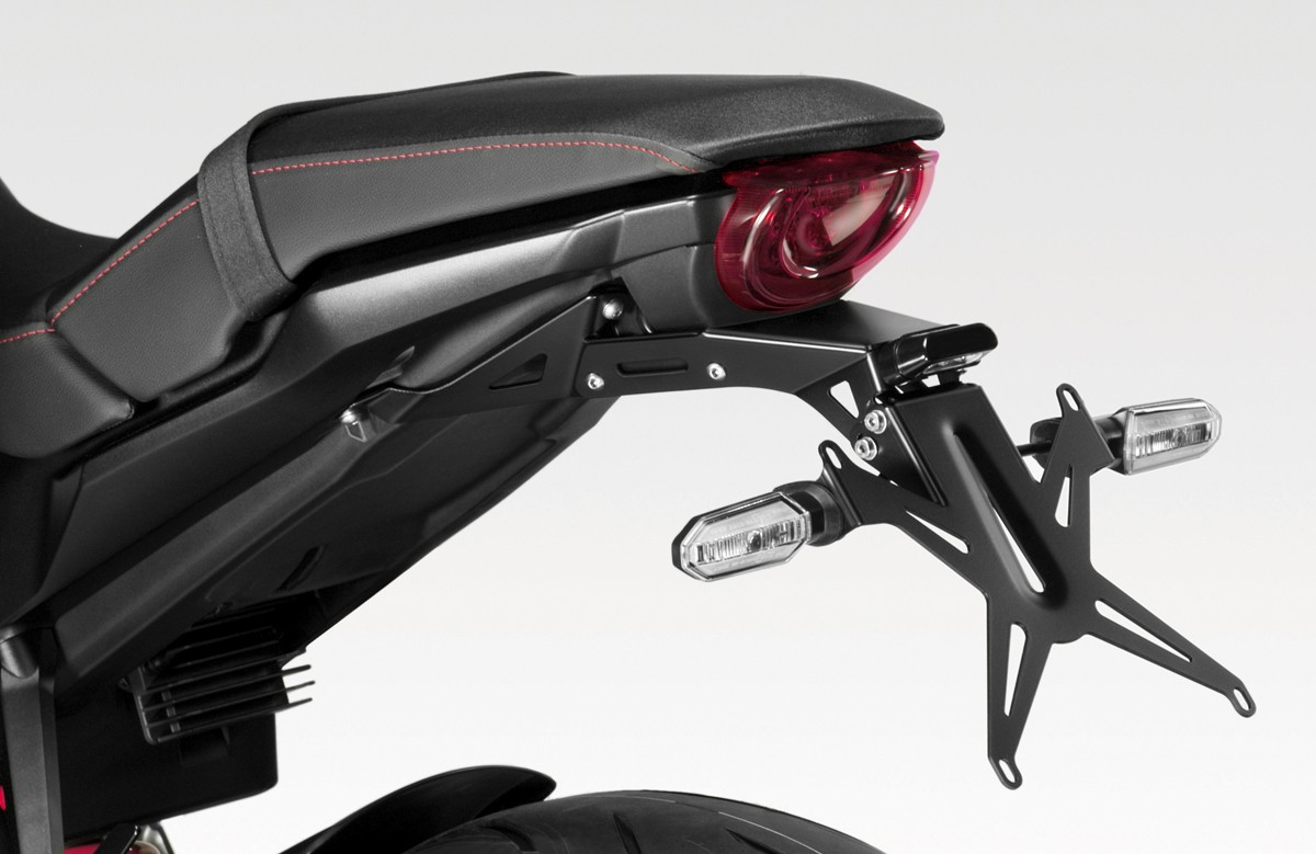 Il kit riposiziona la targa della moto nel modo tradizionale.